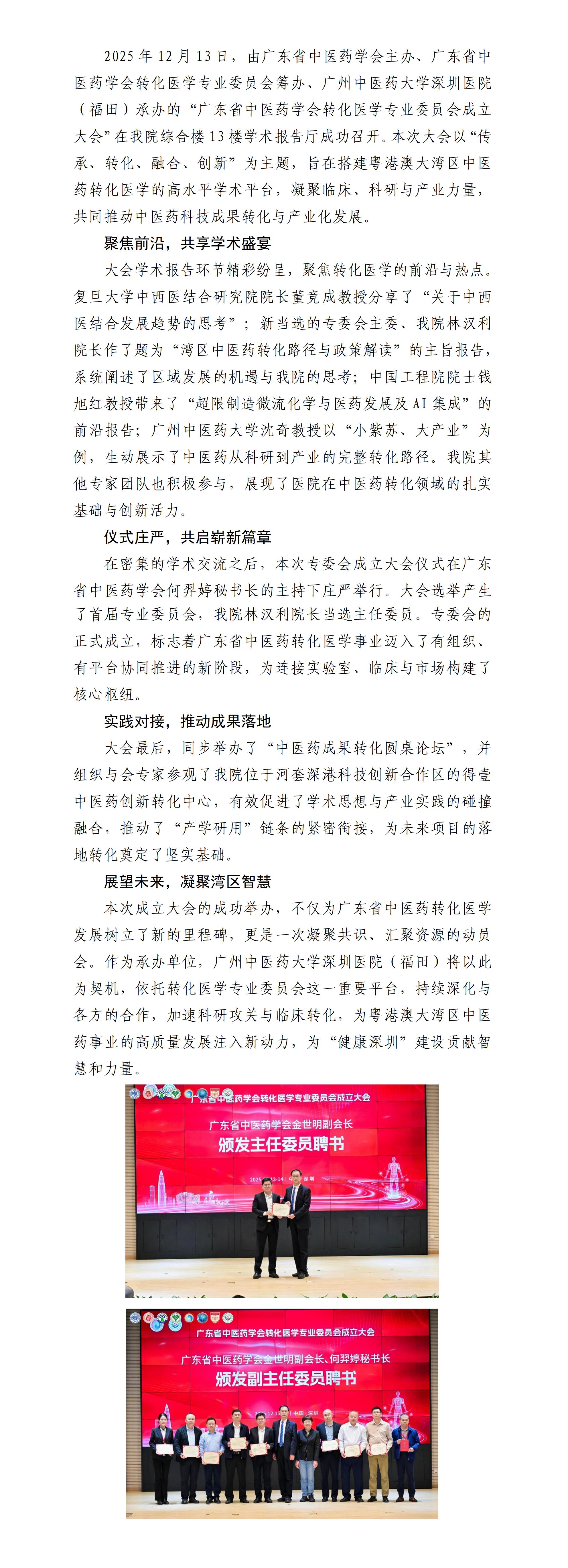 广东省中医药学会转化医学专业委员会成立大会在广州中医药大学深圳医院(福田)成功举办