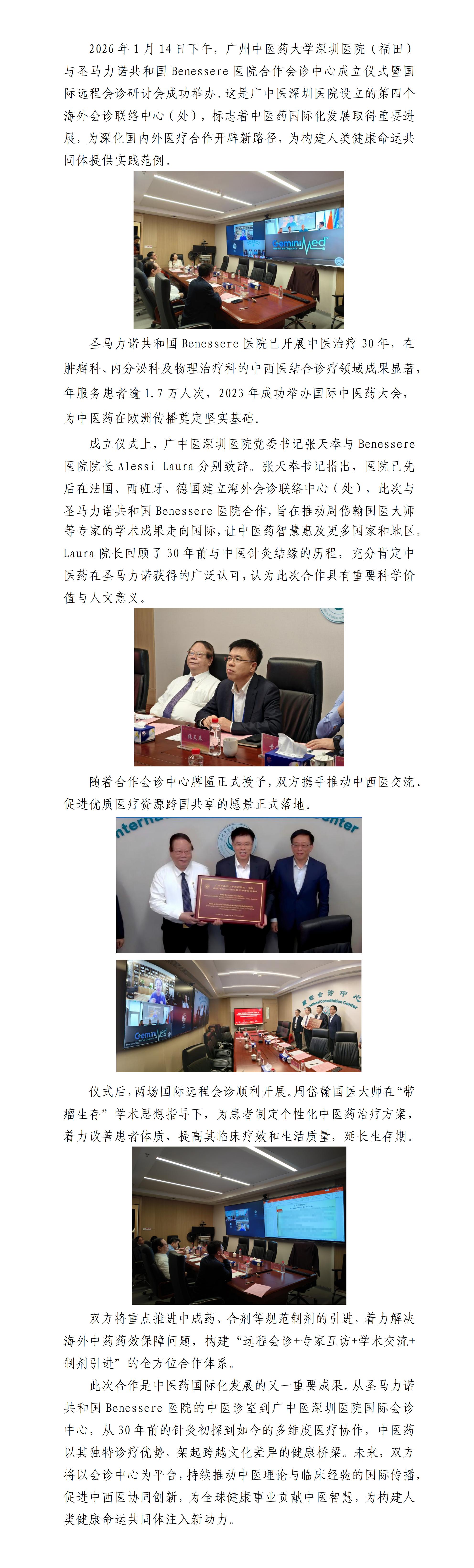中医智慧跨山海 健康合作谱新章——广中医深圳医院与圣马力诺Benessere医院共建国际会诊中心
